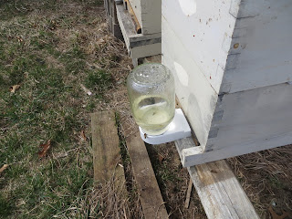 This is the new outer feeder we bought at Theisen's. It is very easy to refill. I think I'll get more of them. This is on the hive that I discovered is queenless. I put some frames with young bees in on St. Patrick's day, but that may be too early develop a queen that will be able to mate. Time will tell.